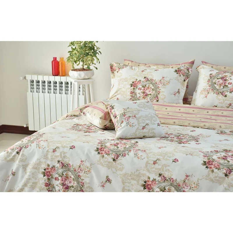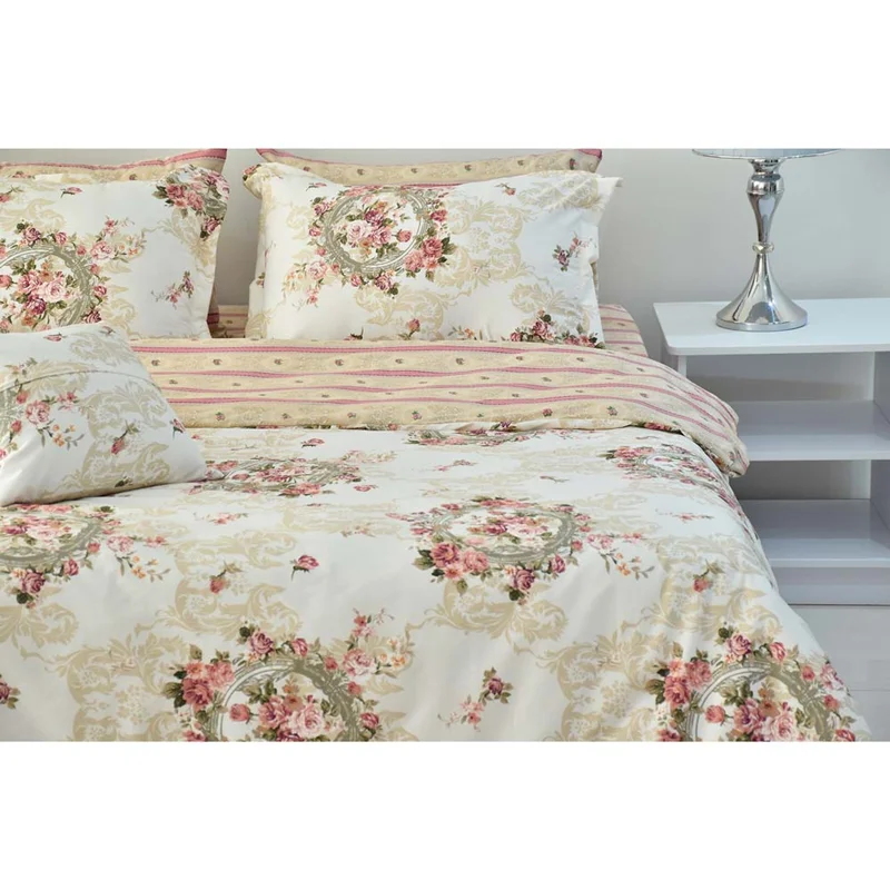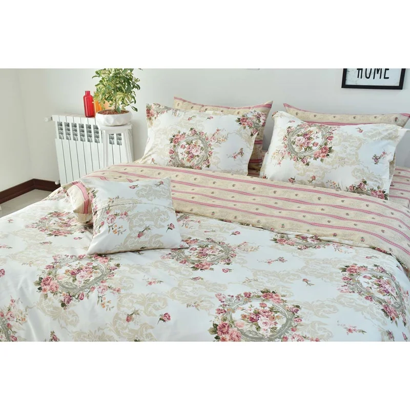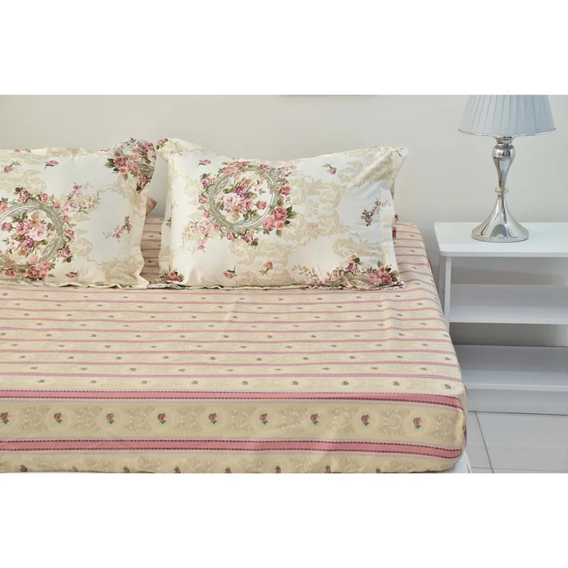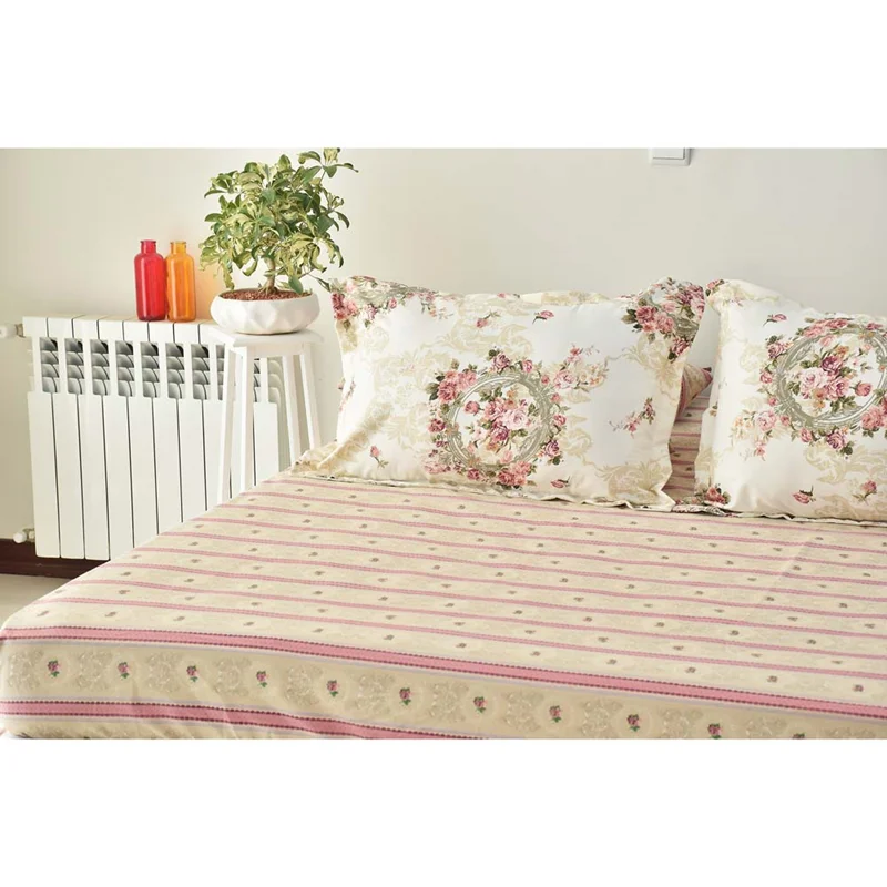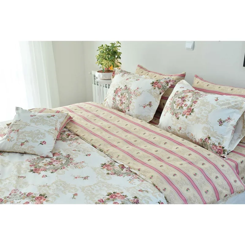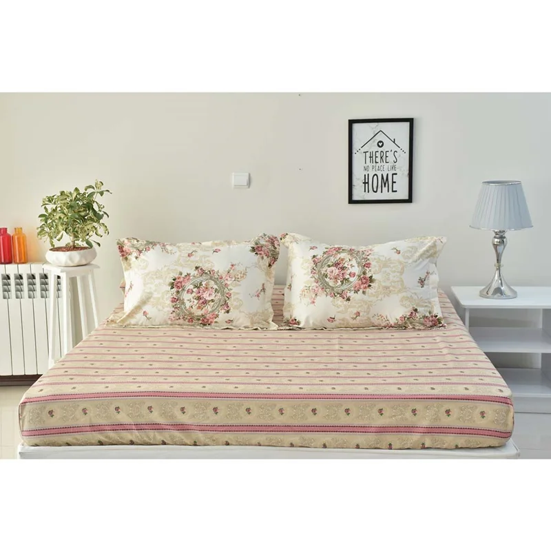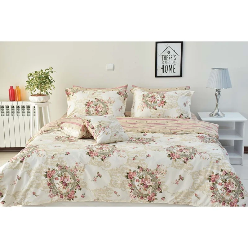 ست کاورلحاف شامل ملحفه کش دار، روبالشتی، روکوسنی و کاورلحاف است که ملحفه کش دار، روکوسنی ها و یک سمت کاورلحاف از پارچه گل ریز و روبالشتی ها و یک سمت کاورلحاف از پارچه گل درشت است.