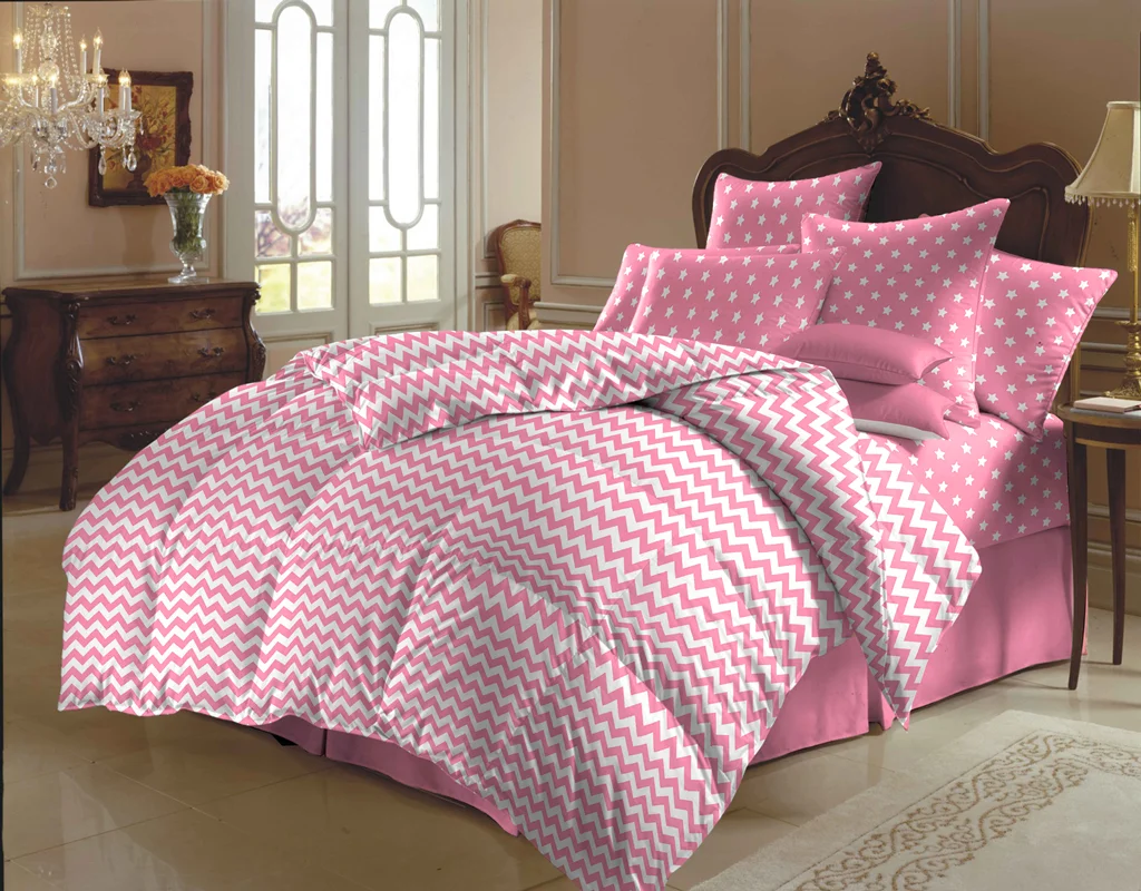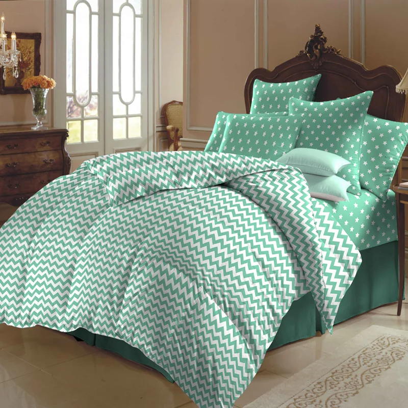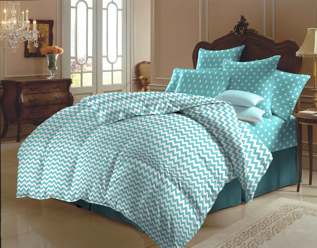 ست کاورلحاف شامل ملحفه کش دار ، روبالشتی ، روکوسنی و کاورلحاف است، که ملحفه کش دار و یک سمت کاورلحاف از پارچه ستاره و روبالشتی و یک سمت کاورلحاف از پارچه زیگزاگ هستن. (روکوسنی متغیره)