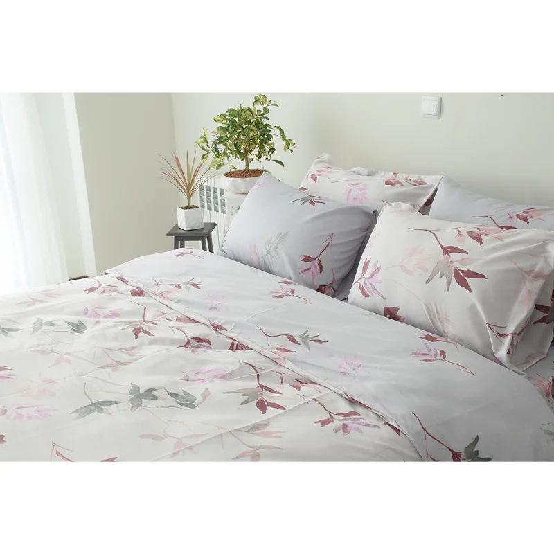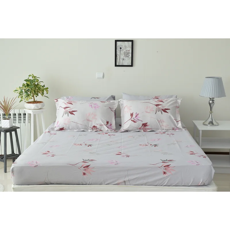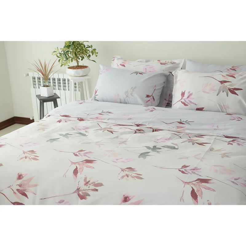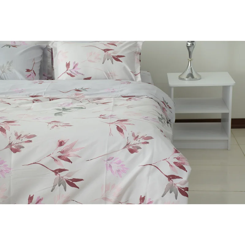 ست کاورلحاف شامل ملحفه کش دار، روبالشتی، روکوسنی و کاورلحاف است که ملحفه کش دار، روکوسنی ها و یک سمت کاورلحاف از پارچه گل ریز و روبالشتی ها و یک سمت کاورلحاف از پارچه گل درشت است.